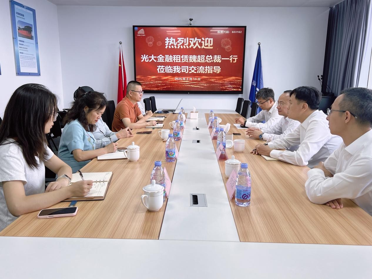 6月19日,光大金融租賃股份有限公司總裁魏超一行蒞臨海通發(fā)展開(kāi)展業(yè)務(wù)交流。雙方圍繞船舶經(jīng)營(yíng)性租賃、市場(chǎng)前景及國(guó)際形勢(shì)等議題展開(kāi)深入探討。海通發(fā)展董事長(zhǎng)曾而斌,副董事長(zhǎng)、總經(jīng)理鄭玉芳,董事、副總經(jīng)理、財(cái)務(wù)總監(jiān)劉國(guó)勇等人熱情接待并參與座談。