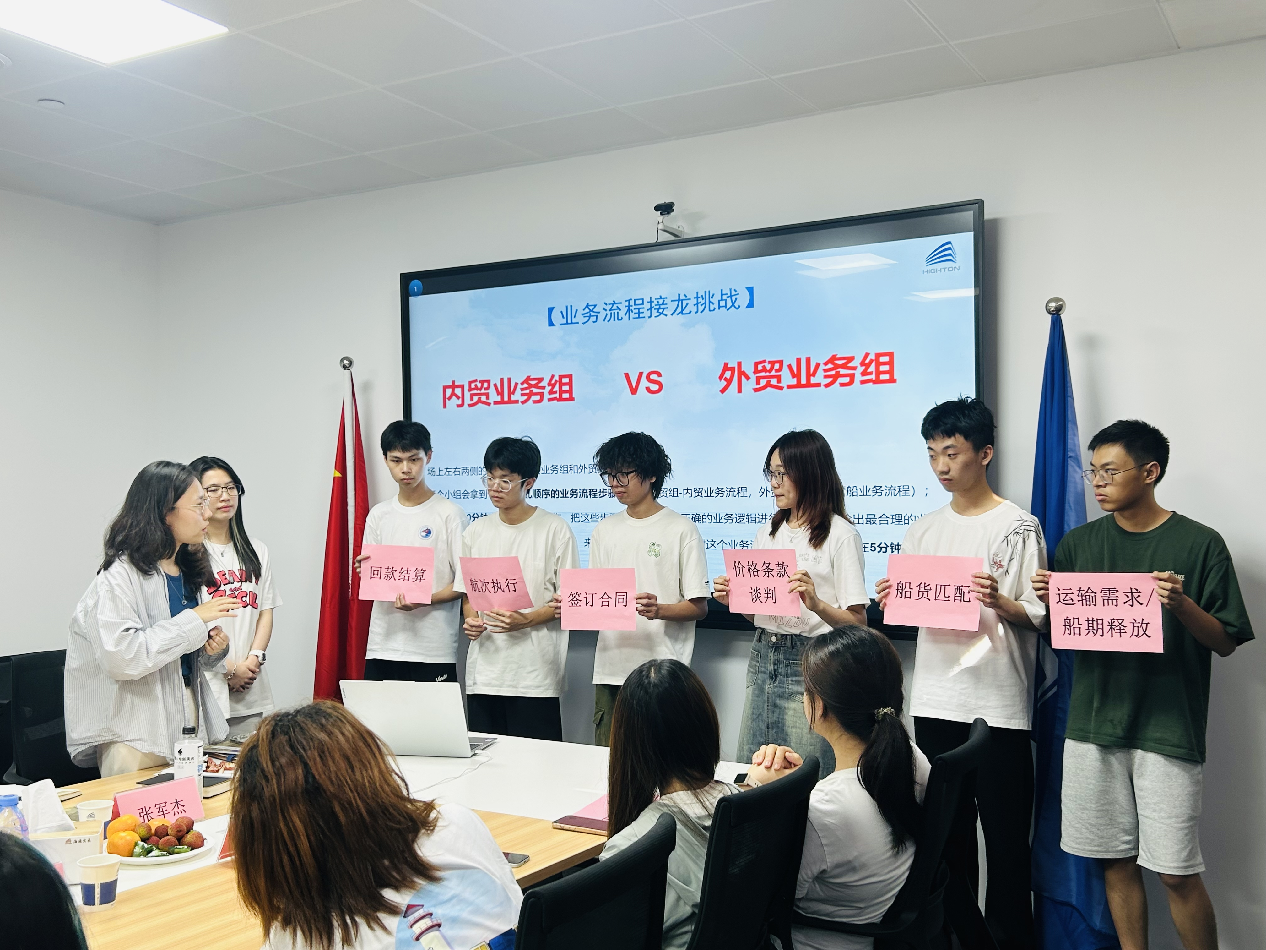 為加深學生對干散貨業(yè)務的理解,由海大優(yōu)秀校友擔任專業(yè)導師,學生們進行內(nèi)外貿(mào)業(yè)務流程接龍?zhí)魬?zhàn)互動環(huán)節(jié),18名學生分為內(nèi)貿(mào)業(yè)務、外貿(mào)業(yè)務兩個小組,在10分鐘內(nèi)完成業(yè)務流程排序與梳理。展示環(huán)節(jié)中,同學們通過流程碎片展示和現(xiàn)場解說,生動呈現(xiàn)了航運業(yè)務的關鍵節(jié)點。學長學姐們對學弟學妹們進行糾錯指導,同時系統(tǒng)講解了實際業(yè)務中的操作規(guī)范與要點。這種"實踐-展示-指導"的教學模式,有效幫助同學們將理論知識與實務相結合,助力學生更準確、深刻地掌握整體業(yè)務邏輯,提升認知效率。